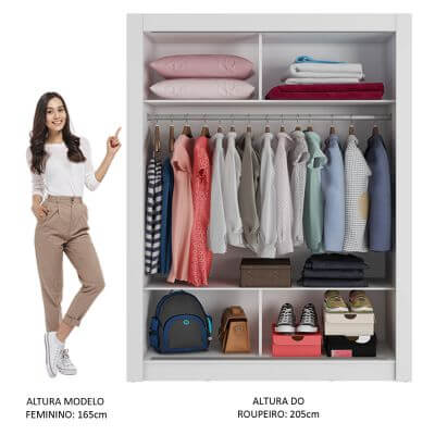 O espaço interno muito bom, com duas prateleiras e quatro nichos, além de um cabideiro de metal resistente e de tamanho diferenciado, 105 cm. Tem espaço para roupas longas, roupas mais curtas, malas, acessórios e muito mais.