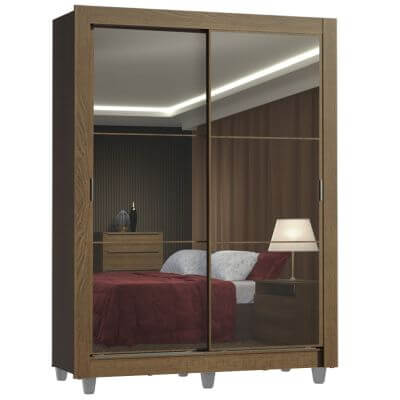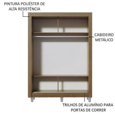 Guarda-Roupa com duas portas de correr de deslizamento suave, trilhos em alumínio, dobradiças metálicas e ferragens de qualidade que proporcionam melhor sustentação ao móvel. Contempla duas prateleiras e quatro nichos, além de um cabideiro resistente e de tamanho diferenciado, 105 cm.