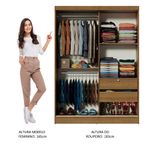 Possui espaços internos bem distribuídos e duas gavetas de fácil manuseio, sendo que uma possui tranca com chave. As portas de correr de madeira permitem fácil acesso interno, além de não comprometer a circulação. O puxador em alumínio é muito resistente e com formato levemente inclinado facilitando a abertura.