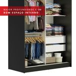 Internamente, contempla duas gavetas com corrediças metálicas, diversas prateleiras e nichos, além de dois cabideiros de madeira com espaço para roupas longas e curtas. A profundidade maior é um grande diferencial.