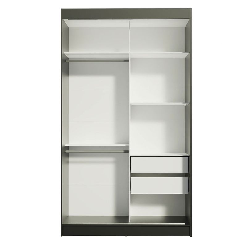 Internamente, contempla duas gavetas com corrediças metálicas, diversas prateleiras e nichos, além de dois cabideiros de madeira com espaço para roupas longas e curtas. A profundidade maior é um grande diferencial.