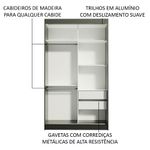 Internamente, contempla duas gavetas com corrediças metálicas, diversas prateleiras e nichos, além de dois cabideiros de madeira com espaço para roupas longas e curtas. A profundidade maior é um grande diferencial.