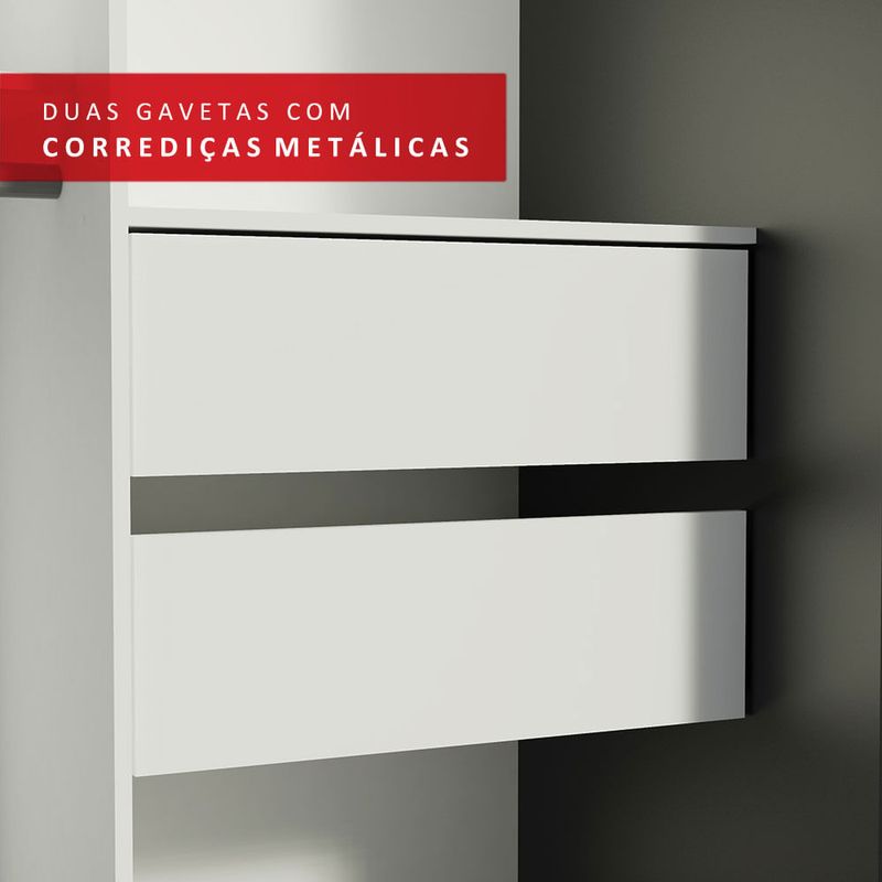 Internamente, contempla duas gavetas com corrediças metálicas, diversas prateleiras e nichos, além de dois cabideiros de madeira com espaço para roupas longas e curtas. A profundidade maior é um grande diferencial.
