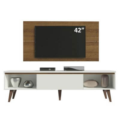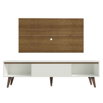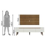O acabamento do rack é branco com detalhes em amadeirado Rustic e o painel é todo branco. O processo é feito em Pintura Poliéster com 7 camadas de proteção, resistente a álcool, água e calor. Além de ser um processo ecológico, isento de vapores que vão para a atmosfera.