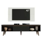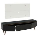 O acabamento do rack é preto com detalhes em amadeirado Rustic e o painel é branco. O processo é feito em Pintura Poliéster com 7 camadas de proteção, resistente a álcool, água e calor. Além de ser um processo ecológico, isento de vapores que vão para a atmosfera.